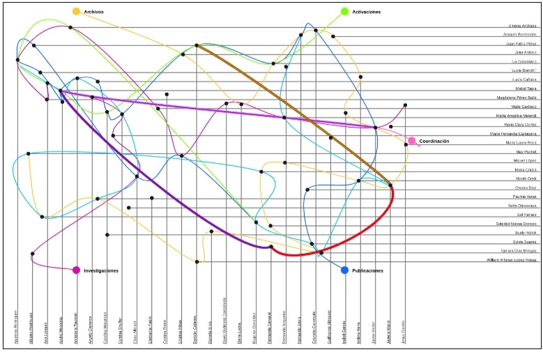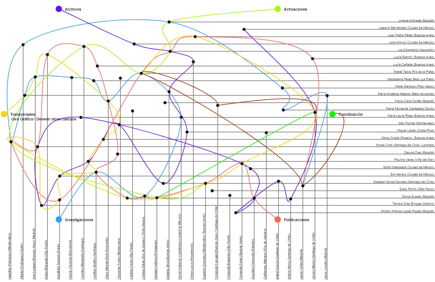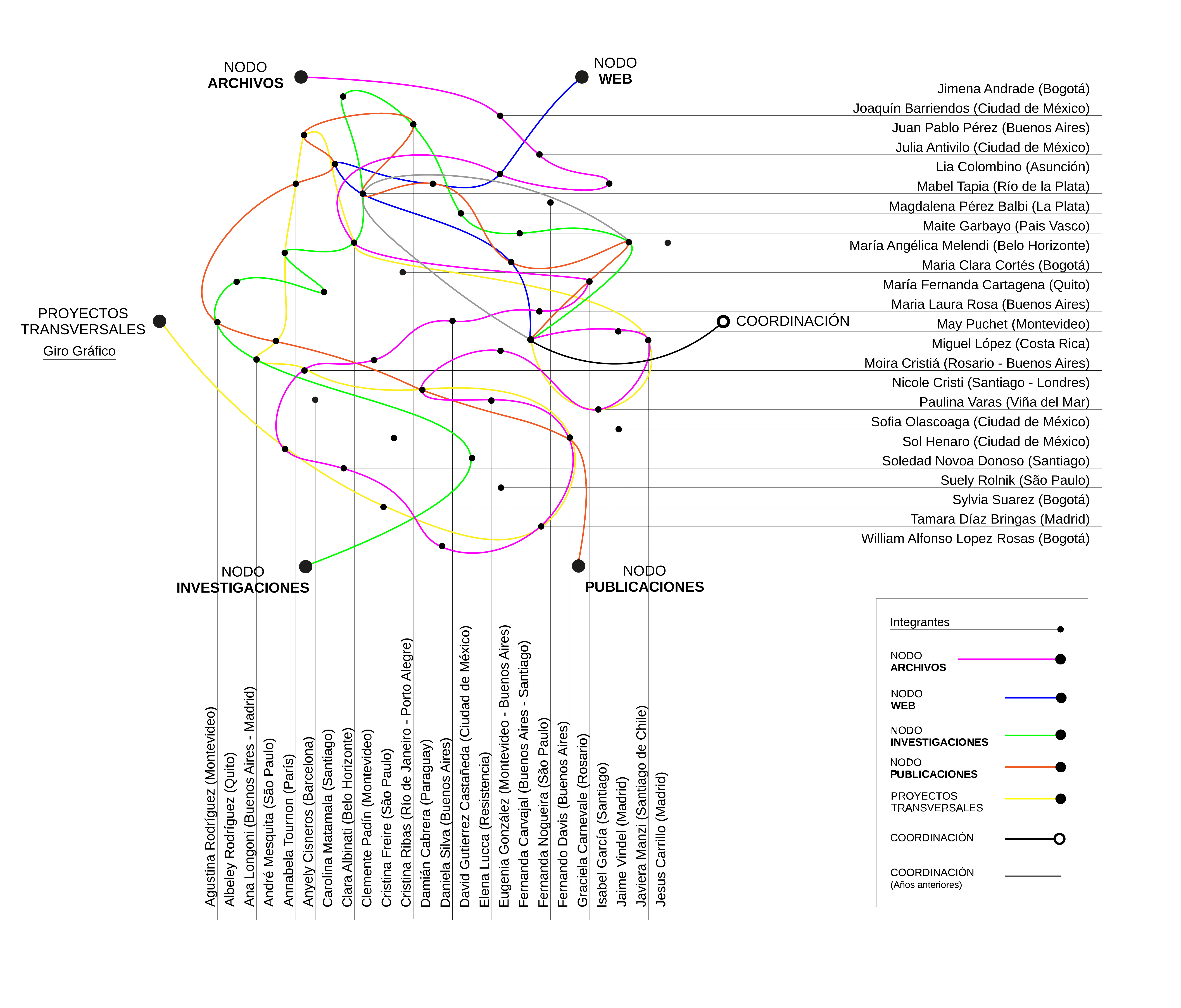 El diagrama organiza a los integrantes de la Red de Conceptualismos del Sur a través de sus nodos de trabajo y conexiones, destacando vínculos de trabajo y líneas de investigación compartidas.