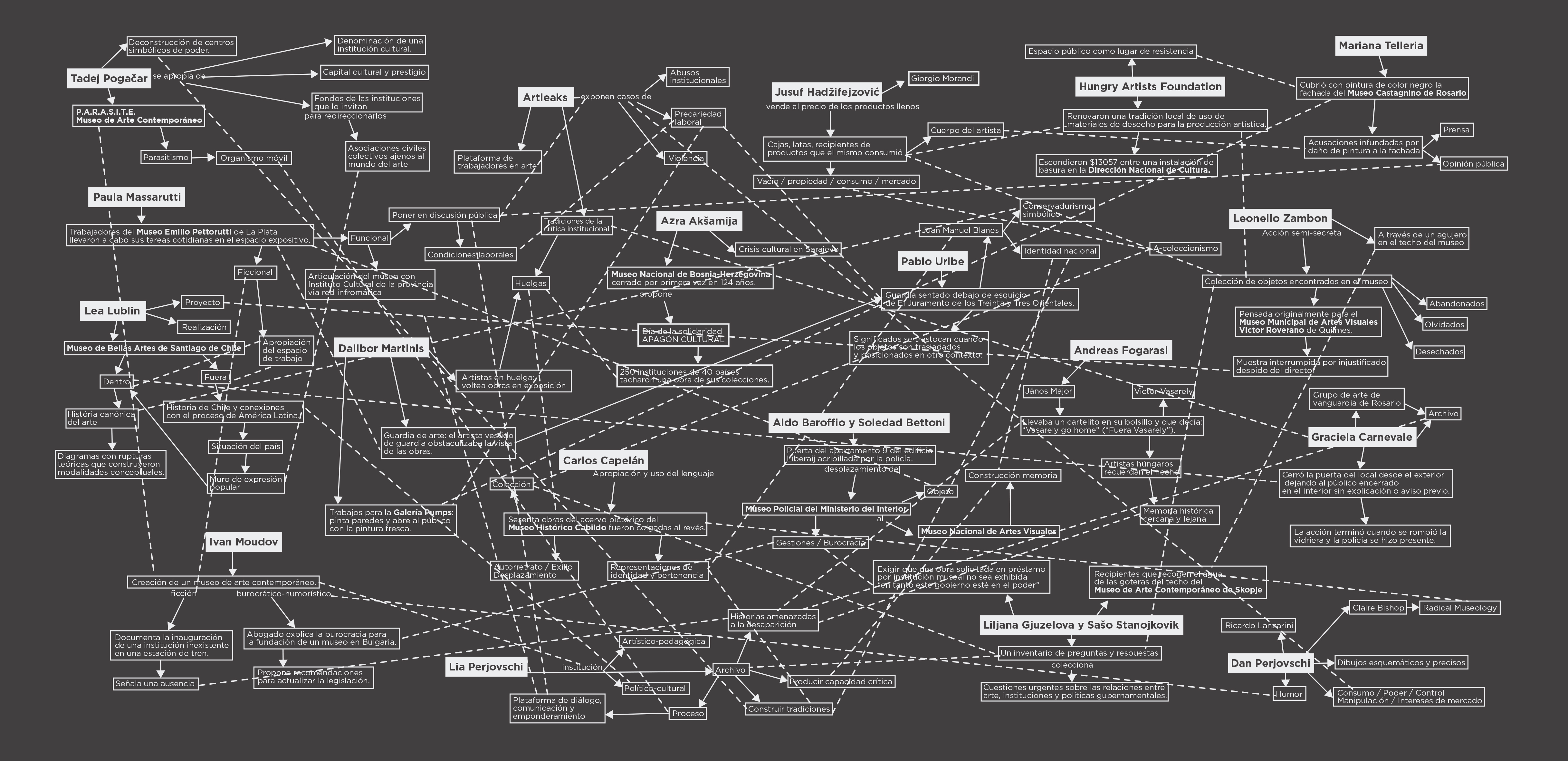 Diagrama realizado para el desplegable de la exposición Témpano. El problema de lo institucional. Cruces entre Europa del Este y el Río de la Plata realizado en el Museo Nacional de Artes Visuales, Montevideo.