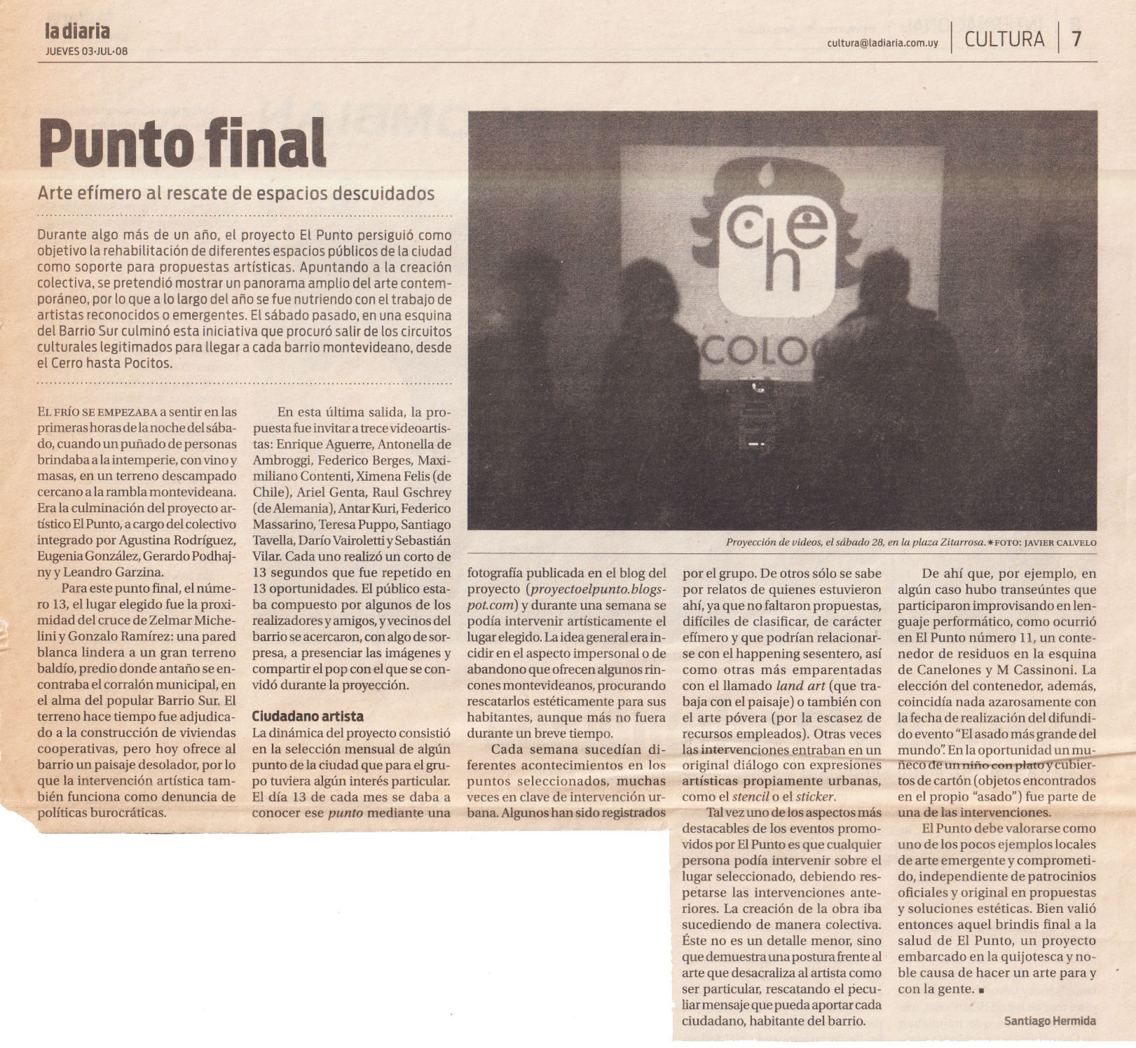 Desde su inicio en junio de 2006, El Punto activó diez ubicaciones en Montevideo, ocupando sitios tan variados como un banco de plaza, la fachada de un bar abandonado o los cimientos en ruinas de la ex cárcel de mujeres. Artistas legitimados y emergentes participaron en este proceso, trabajando con un presupuesto mínimo. Además de la intervención en sí, el proyecto mantenía un registro en su blog y difundía cada activación.