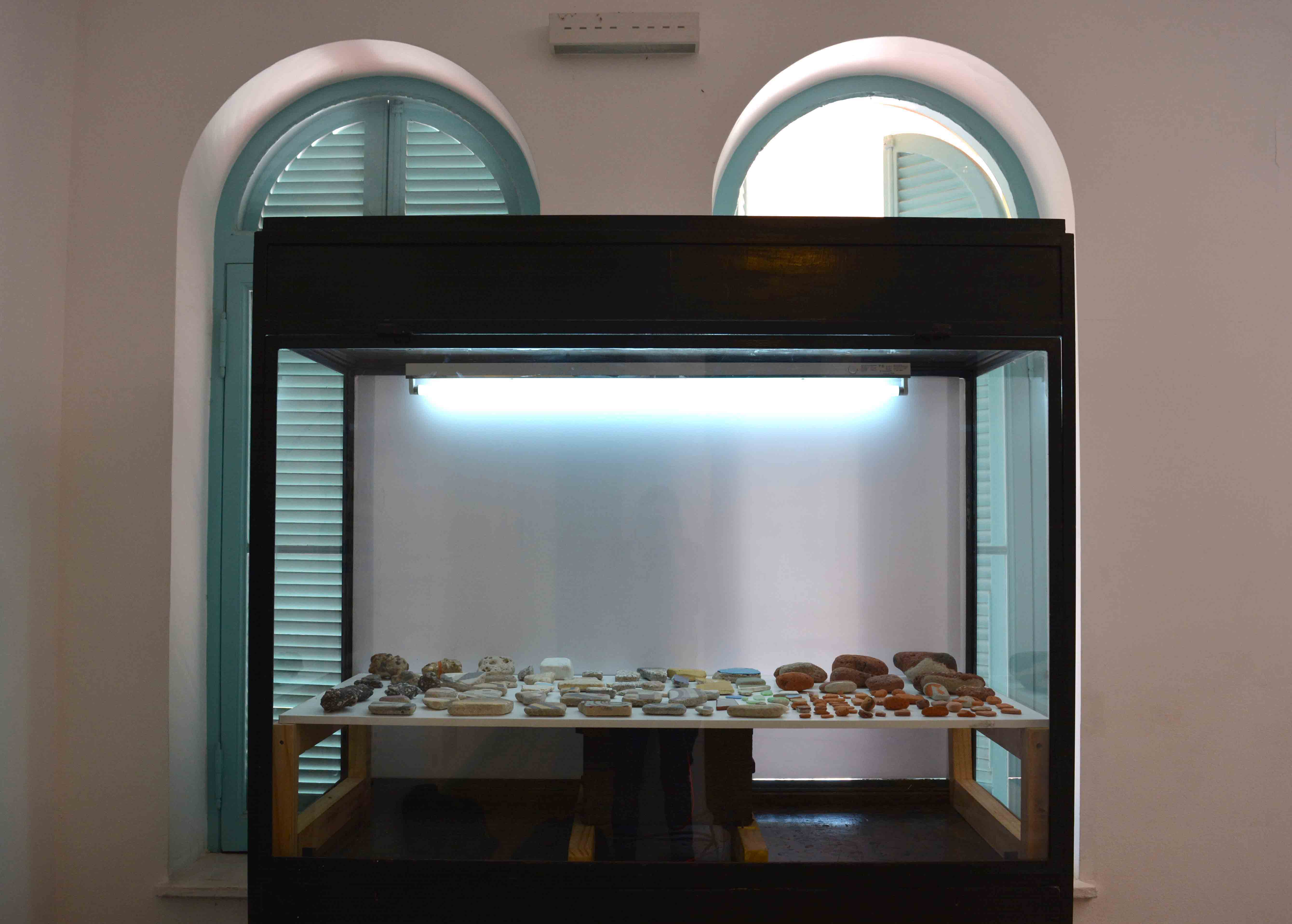 Instalación sonora realizada con fragmentos de paredes y pisos encontrados en la Reserva Ecológica de La Ciudad de Buenos Aires, tabla, amplificador, reproductorde sonido.