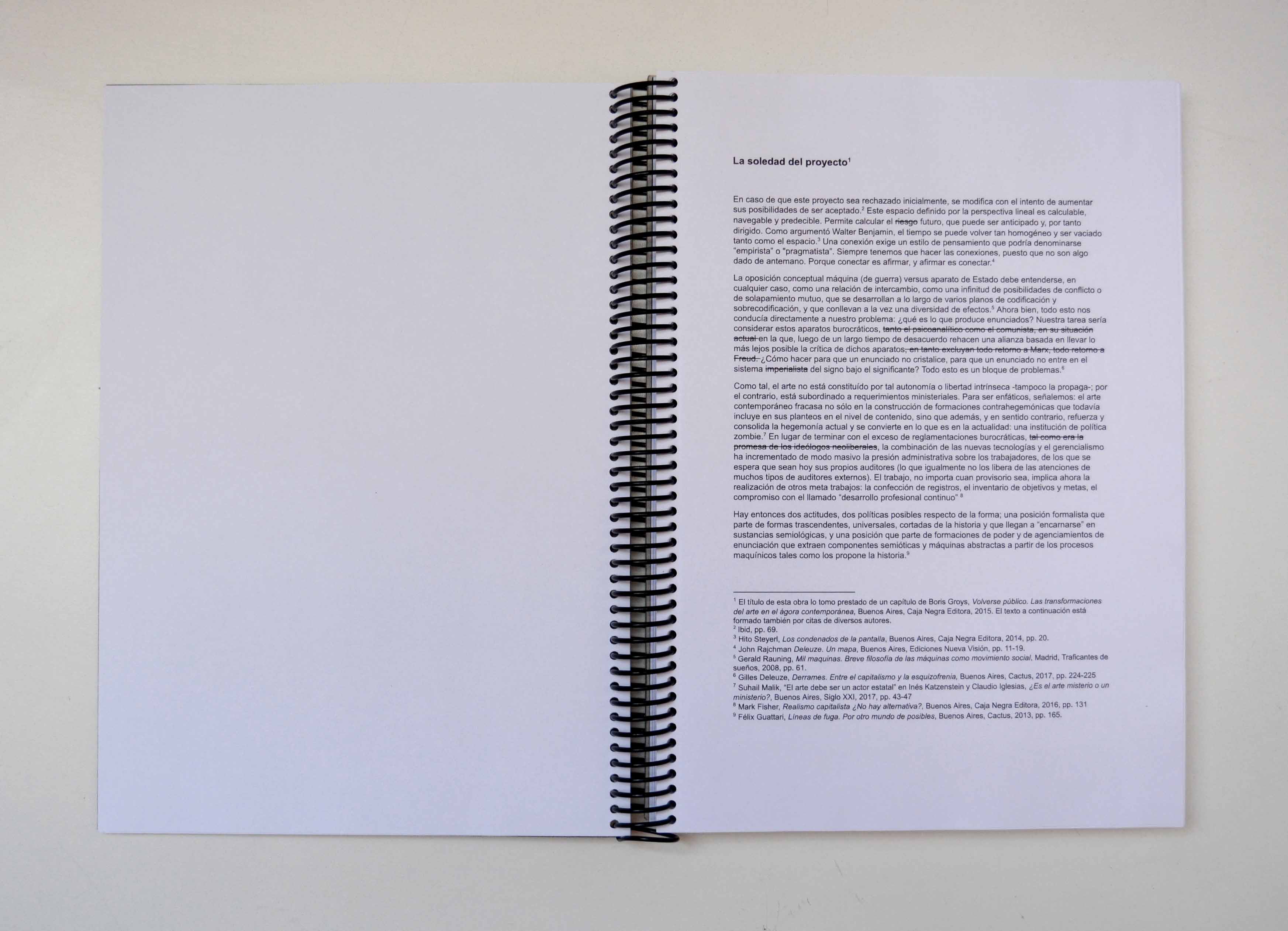 La soledad del proyecto —título tomado de un capítulo del libro Volverse público de Boris Groys— es un libro que reúne formularios reales para la presentación a fondos de arte, reconfigurados como dispositivo crítico. A través de una compilación que es al mismo tiempo una coreografía de repeticiones, ajustes y gestos burocráticos, la obra explora la dimensión solitaria, abstracta y programática del arte contemporáneo en sus vías de institucionalización.