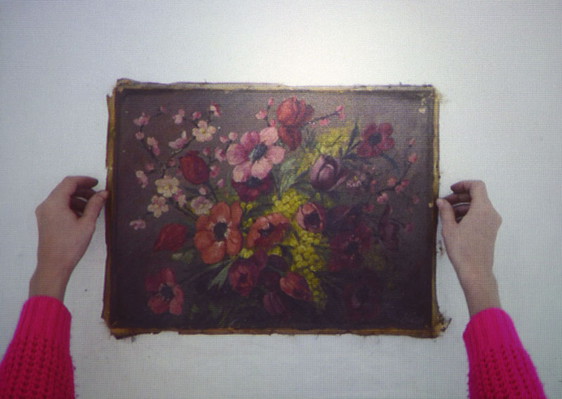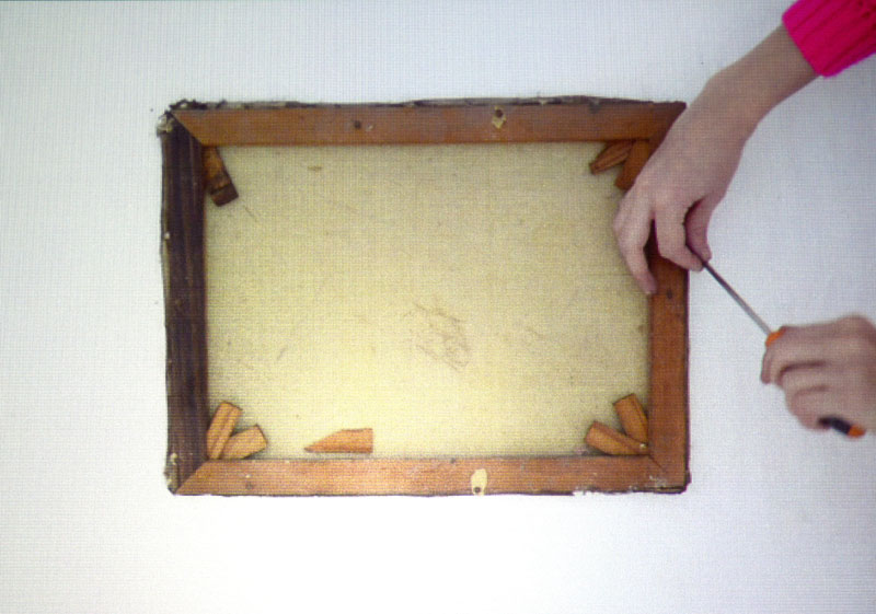 Instalación que exhibe el desmontaje de una pintura y descompone los diferentes elementos que la integran -tela, bastidor, cartón, marco- mostrándolos como elementos independientes para desnaturalizar su rol en su construcción material del objeto en cuestión.