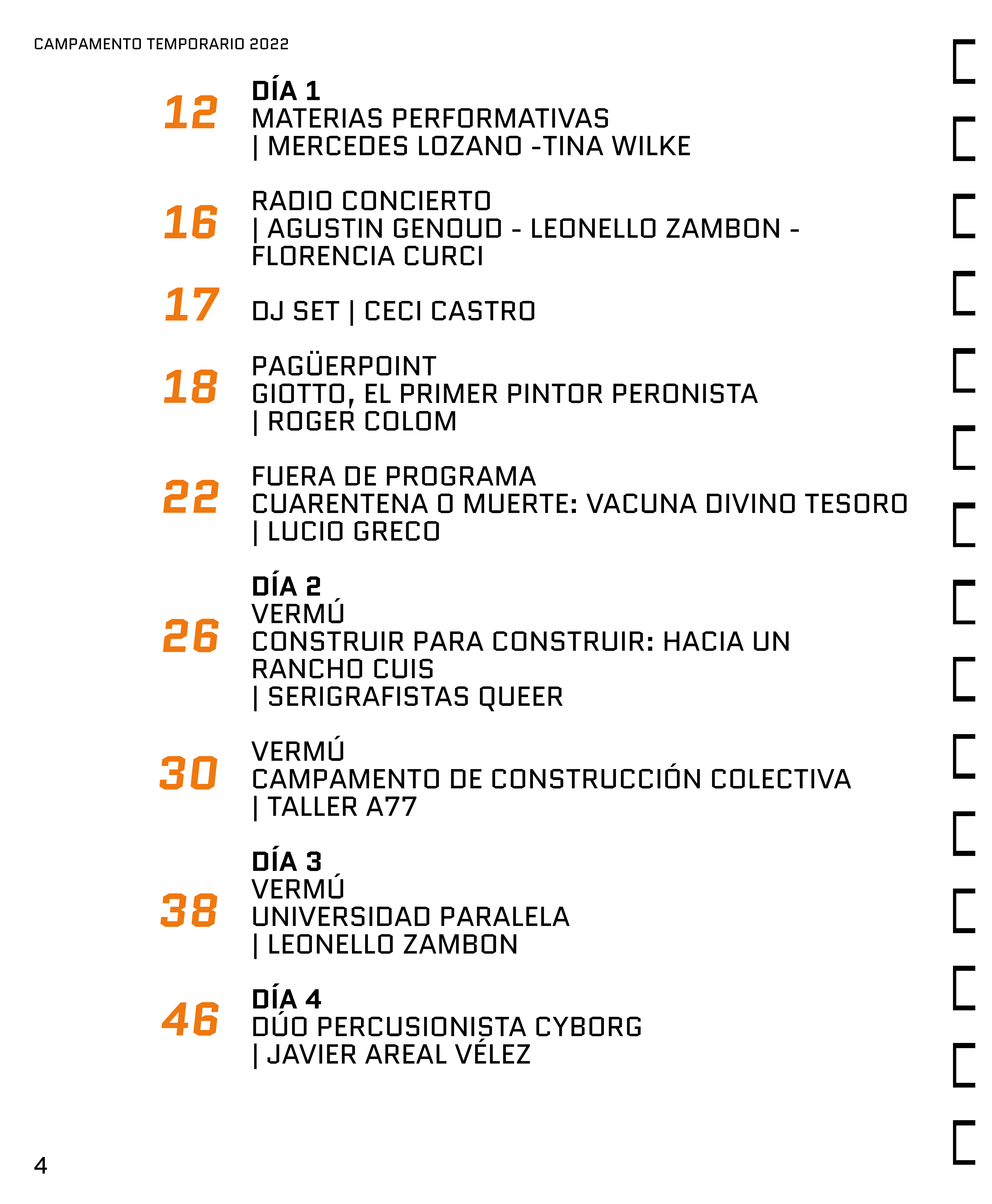 Siguiendo el impulso y la experiencia del primer campamento, realizado en 2019, en esta segunda edición, un nuevo grupo de creadorxs realizará actividades culturales y educativas: performances participativas, muestras interactivas, caminatas, conversatorios y cocina compartida entre artistas y vecinxs sobre problemáticas en torno al territorio urbano, el medioambiente, la inclusión social y la gestión de lo común.